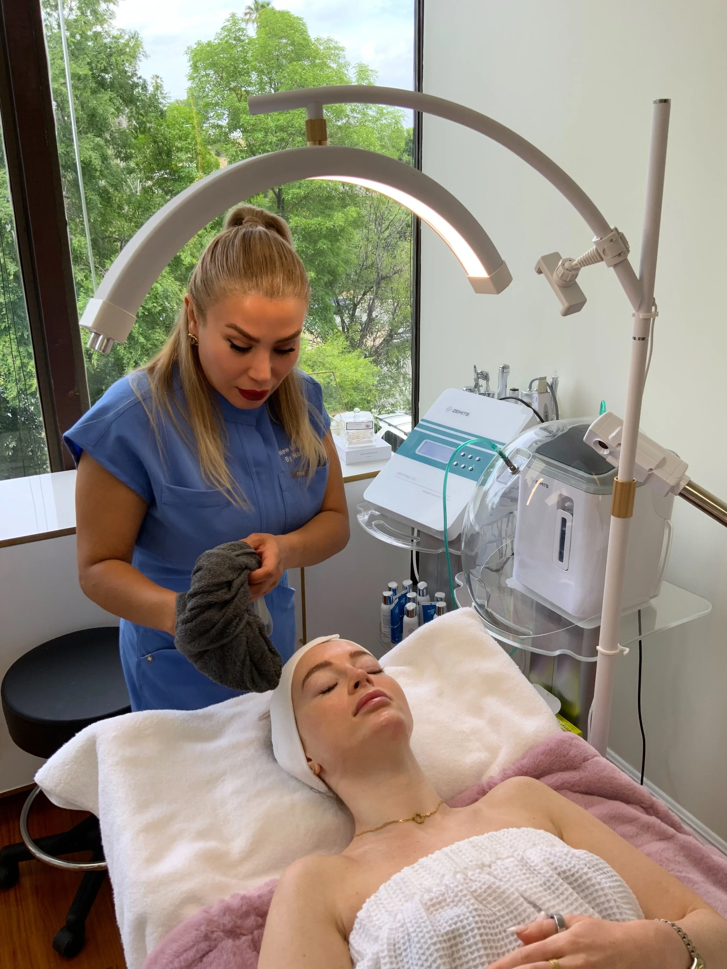Skin treatment where controlled carbon dioxide gas is applied. Improve skin glow, radiance, deep hydration, skin plumping, stimulates collagen production, helps acne, inflammation, improves skin texture and tone.